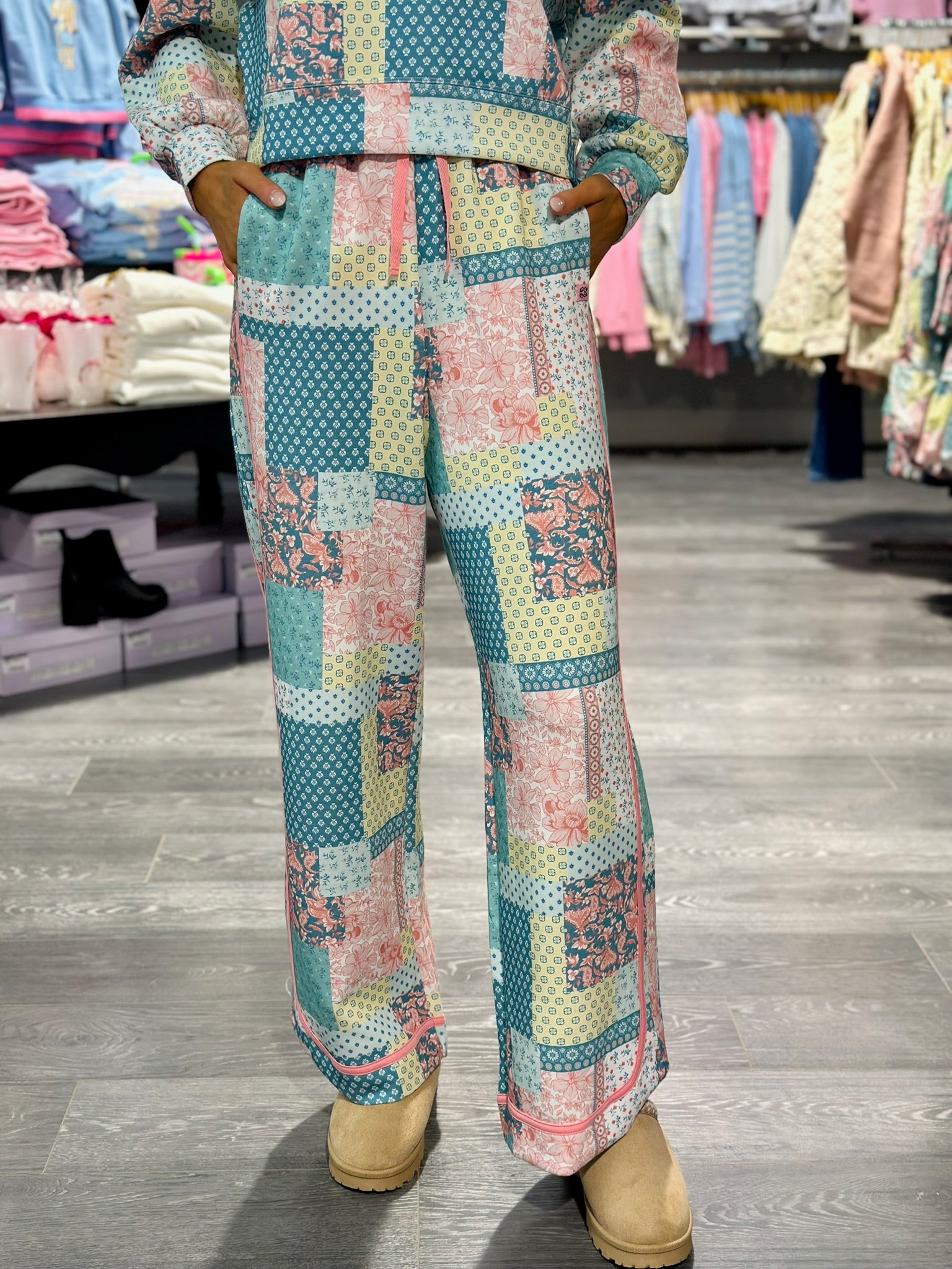 The comfort of a lounge pant with the style of patchwork print! Everyone who tries these pants on, immediately falls in love!