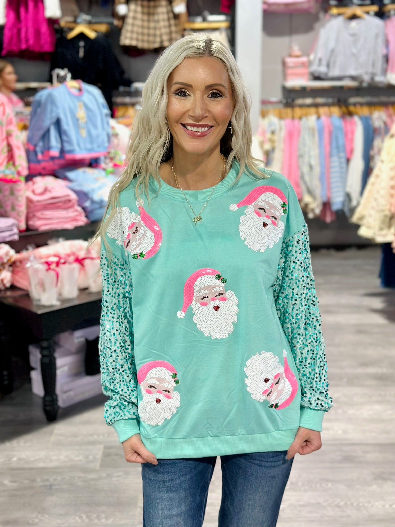 Save on holiday favorites at Krush! Grab our sequin sleeve sweatshirt with patches of Santa for only $18.99!