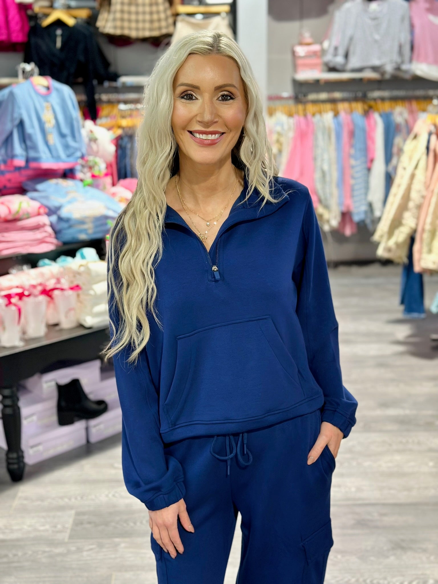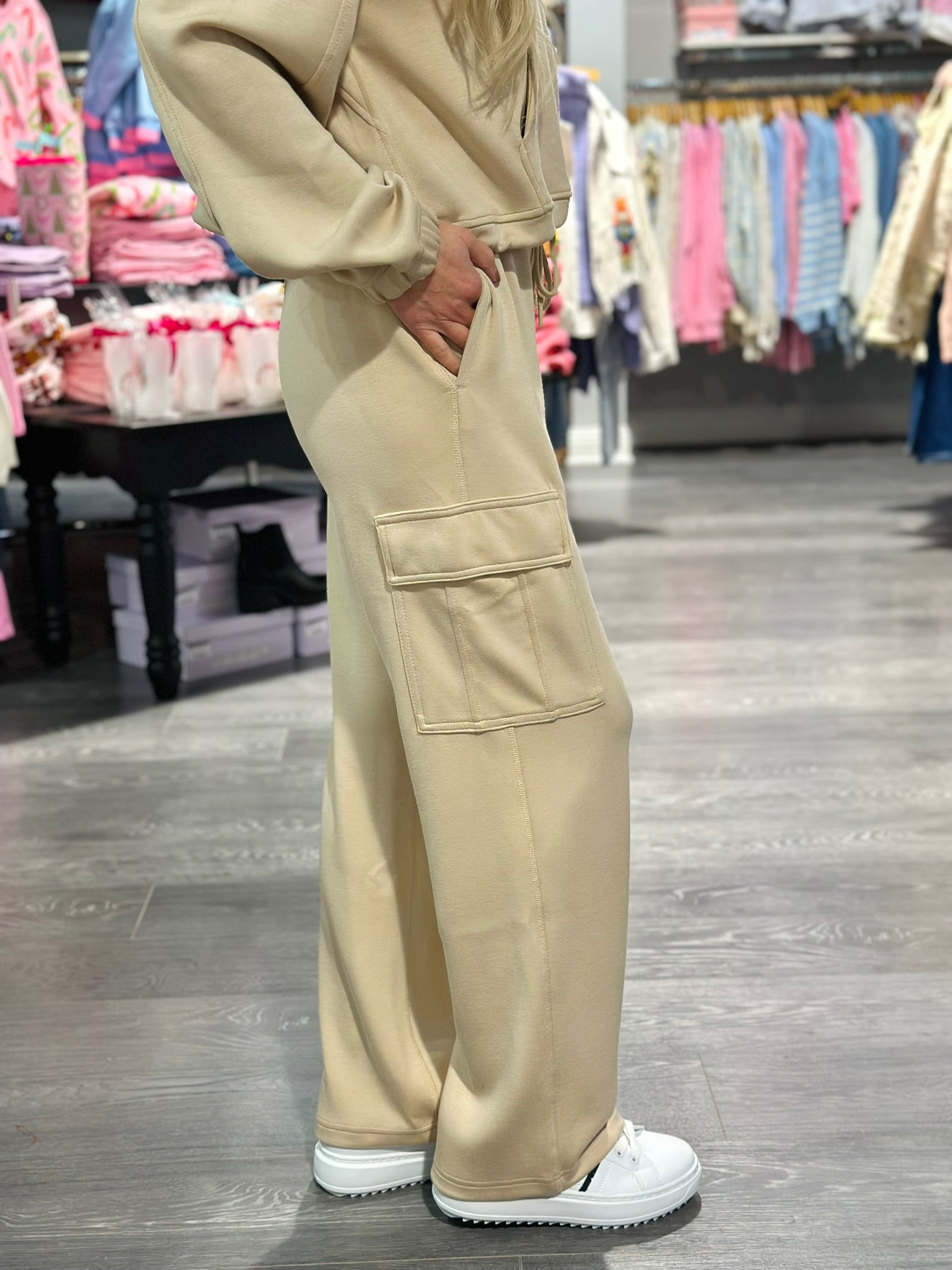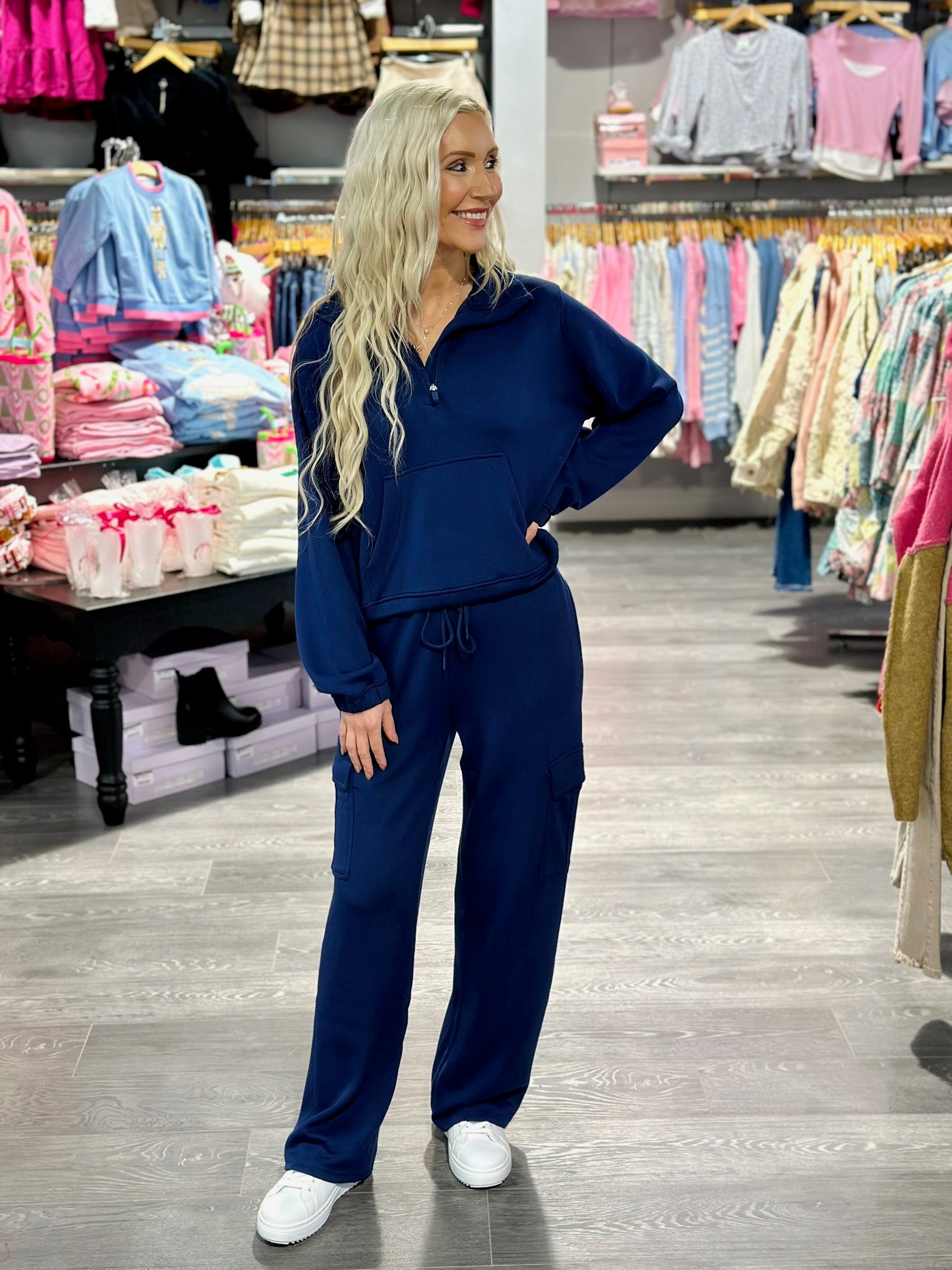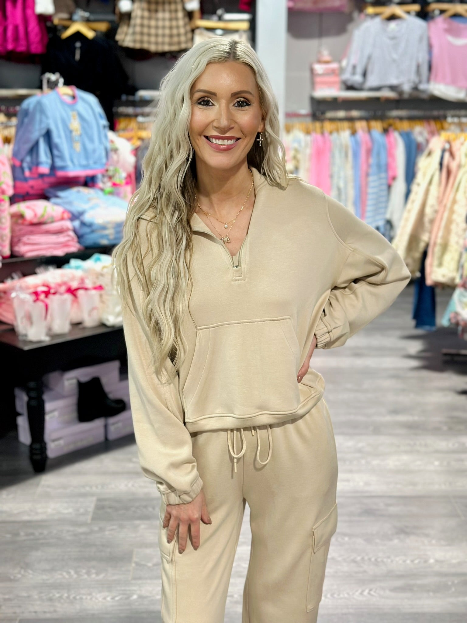 Meet your new everyday favorite — this ultra-comfy two-piece set is the perfect blend of relaxed style and effortless polish. Designed with a soft, cozy fabric, the half-zip pullover features a roomy front pocket and a slightly oversized fit for that laid-back look you love. The matching cargo pants include functional side pockets, an adjustable drawstring waist, and a straight-leg silhouette that keeps things both flattering and comfortable.