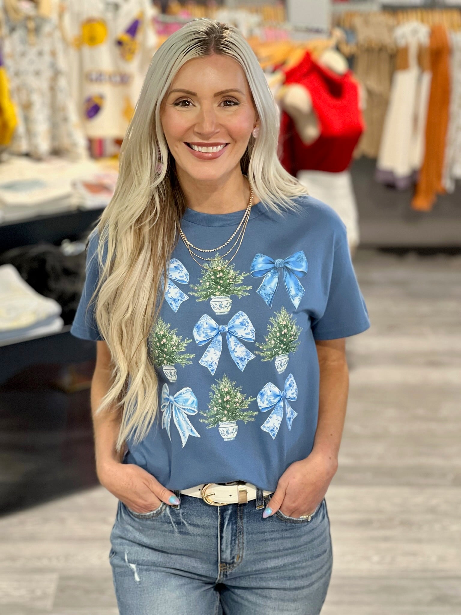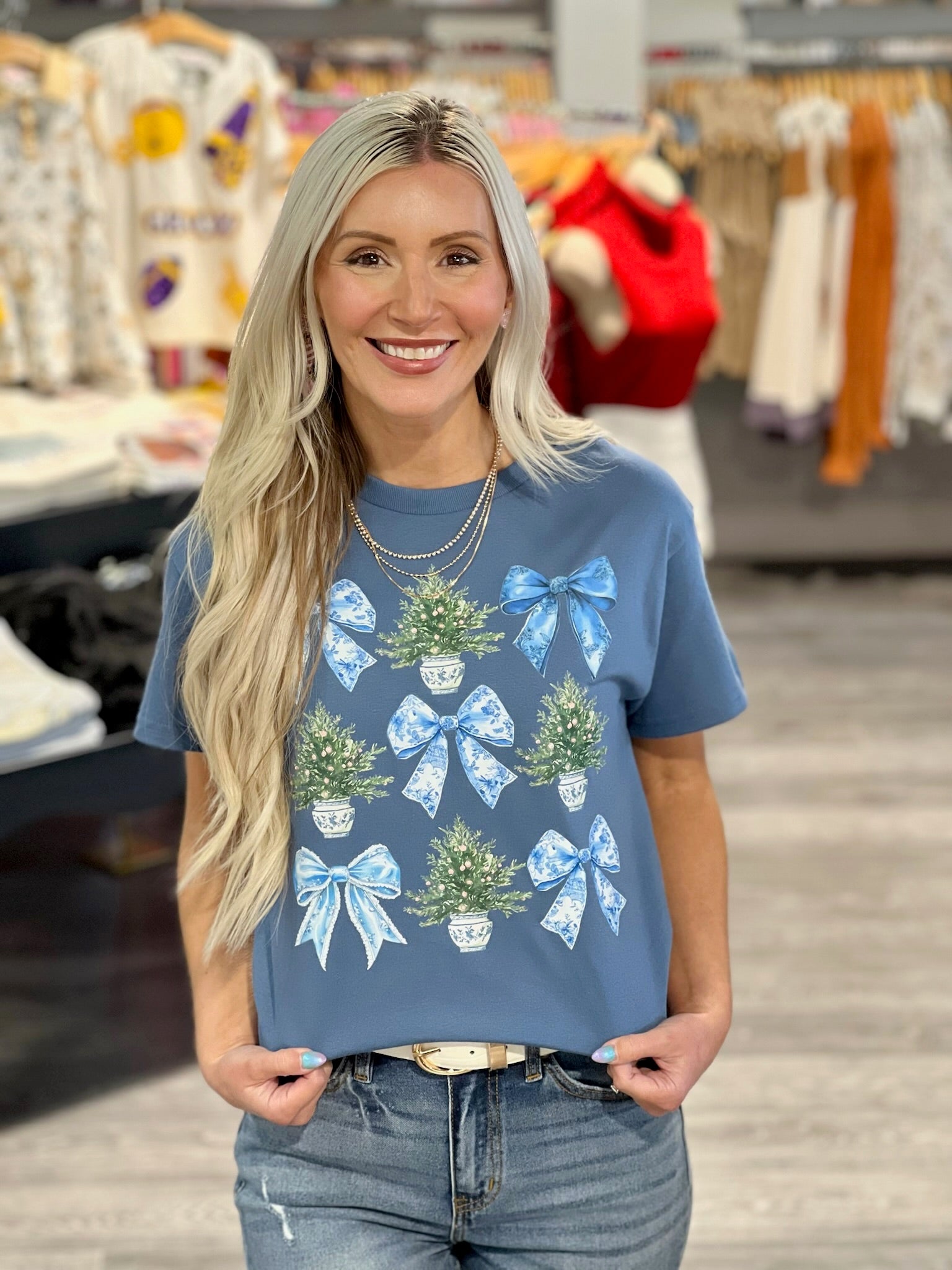 Spread some holiday cheer in this festive tee, featuring cute blue bows for a touch of Christmas charm. Perfect for cozy days and merry celebrations! Model is wearing a size small.