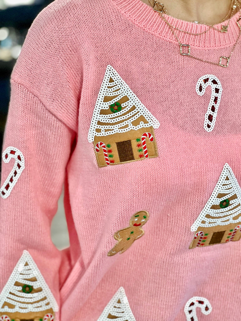Add a sprinkle of holiday magic to your wardrobe with this pink gingerbread house knit sweater! Featuring a sweet and whimsical gingerbread house design, this soft and cozy knit brings festive charm to every outfit. Perfect for cookie baking, holiday parties, or just staying cute and comfy all season long!
