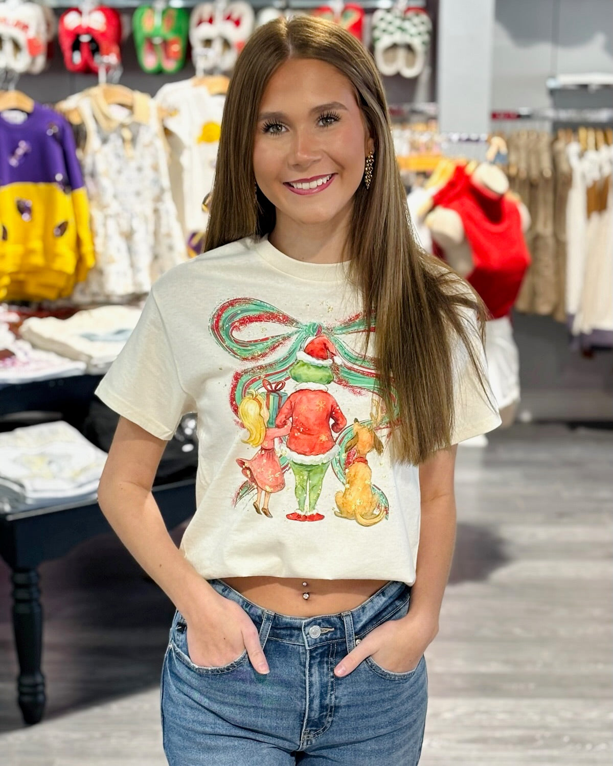 Spread some holiday cheer in this festive tee, featuring the Grinch squad for a touch of Christmas charm. Perfect for cozy days and merry celebrations! Model is wearing a size small.