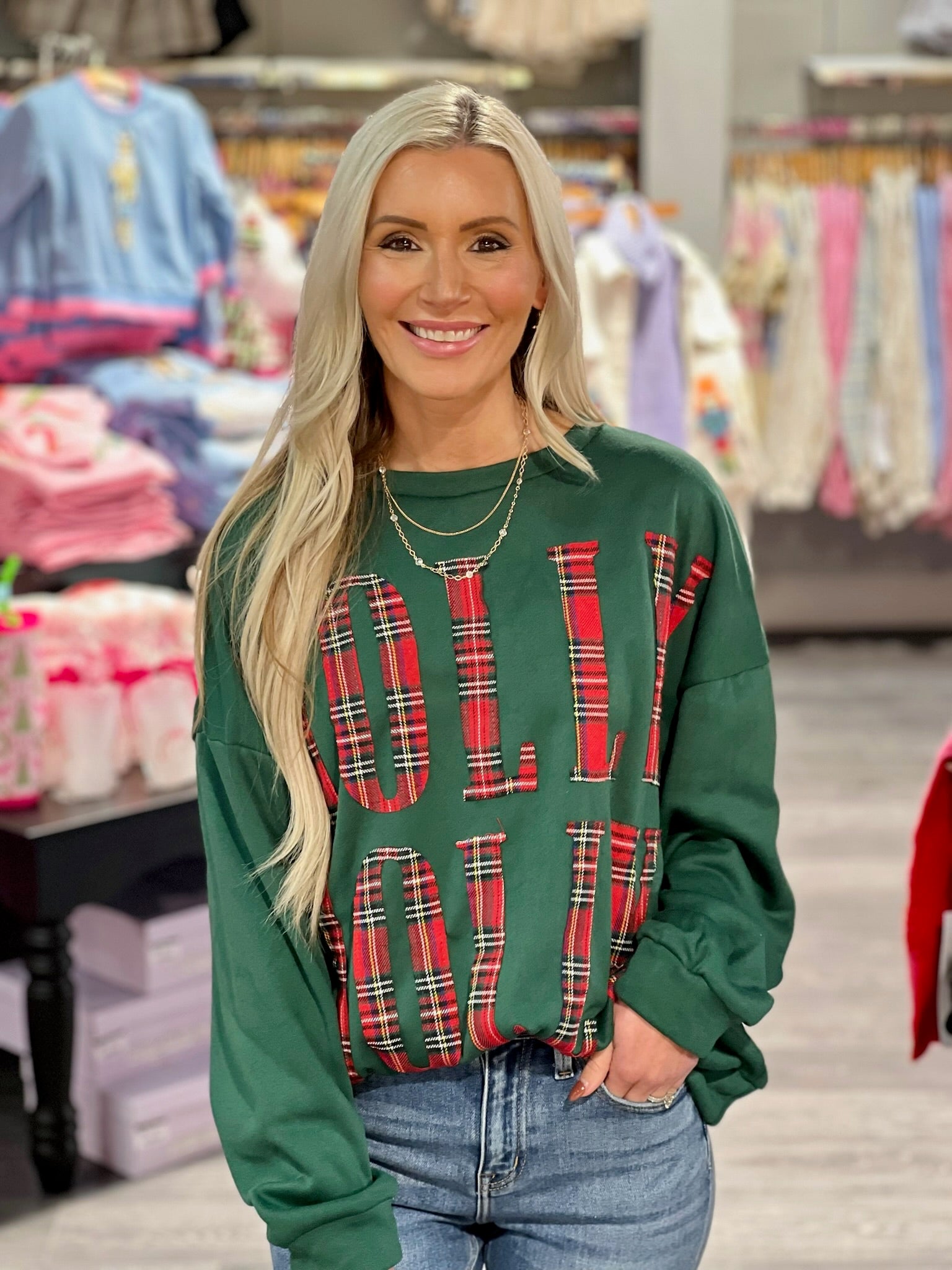 This festive sweater spreads holiday cheer with its bold message showcased in classic plaid across the front. Crafted from soft, cozy fabric, it offers warmth and comfort while keeping your look merry and bright. The playful lettering and cheerful design make it a perfect choice for holiday parties, seasonal outings, or cozy nights by the fire, bringing a fun and spirited touch to any festive wardrobe!