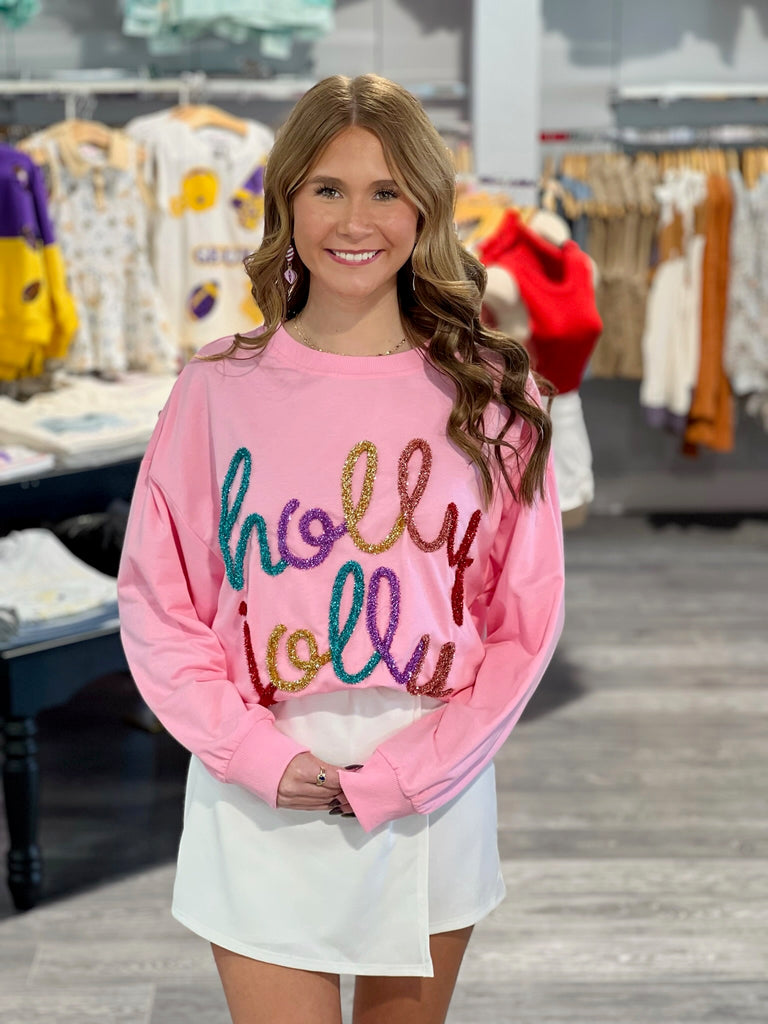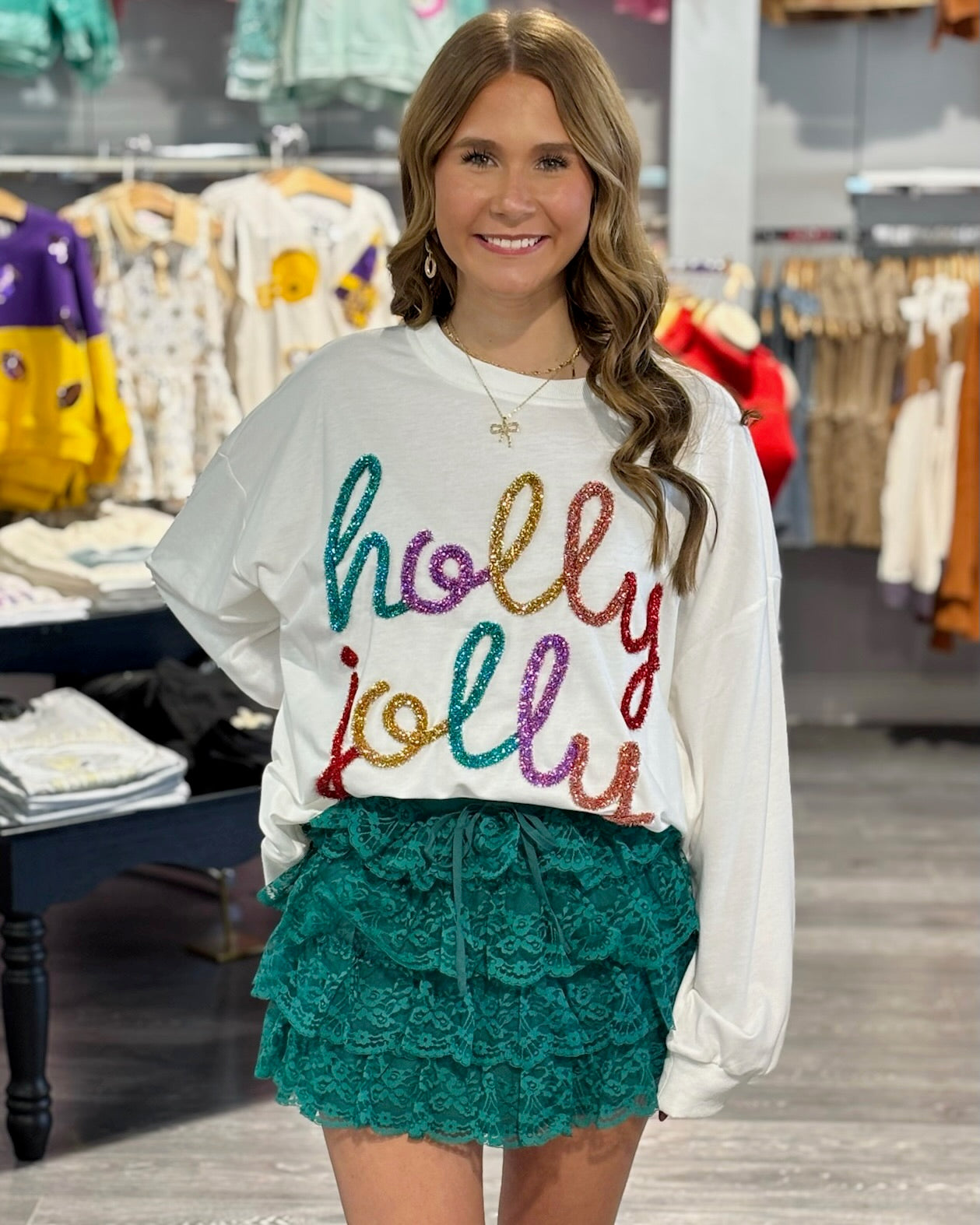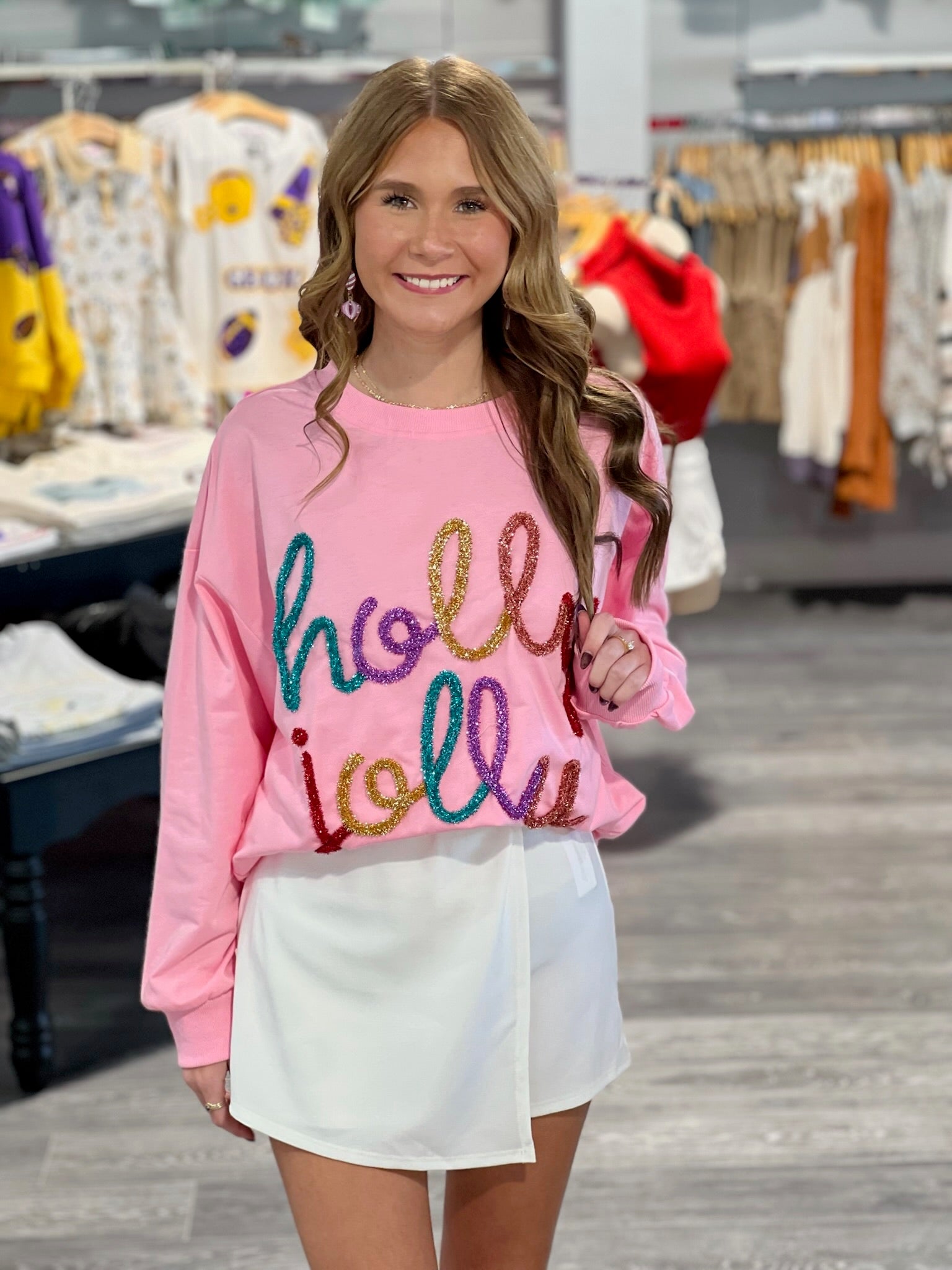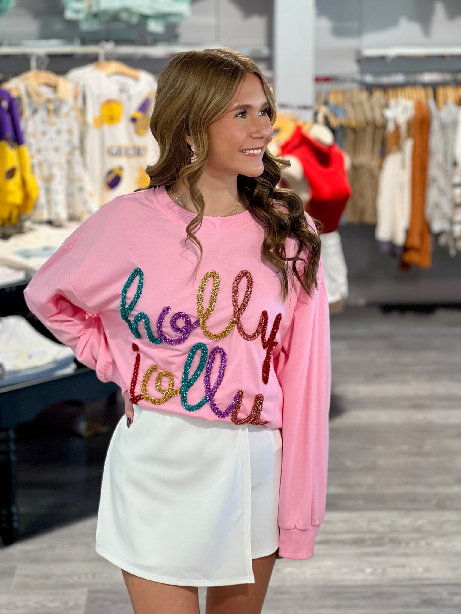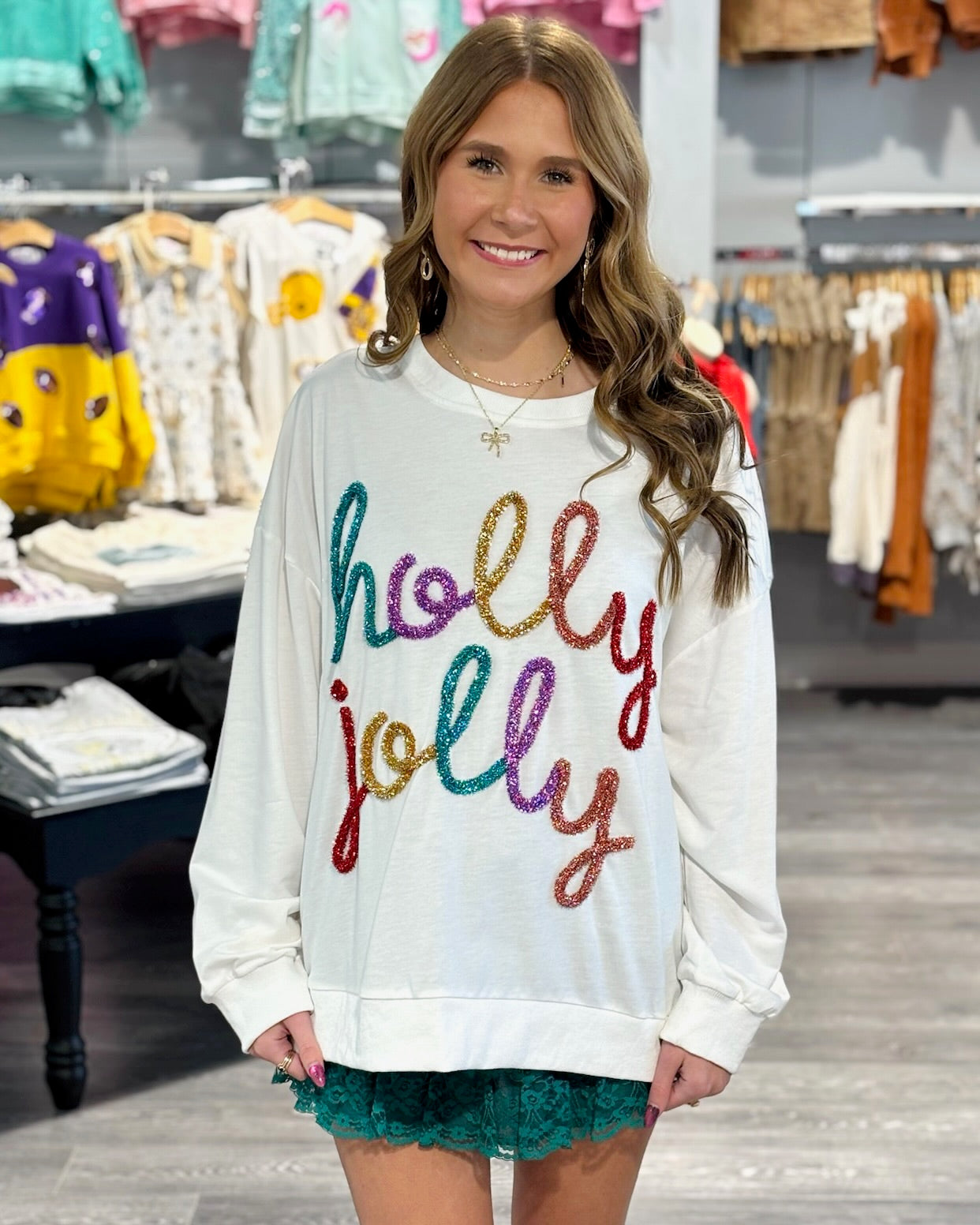Brighten up your winter wardrobe with this playful white sweater featuring sparkling rainbow tinsel accents. Soft, cozy, and full of cheerful charm, it adds a fun pop of color and sparkle to any outfit. Perfect for festive occasions, casual days, or spreading joy all season long, this sweater is a whimsical must-have!