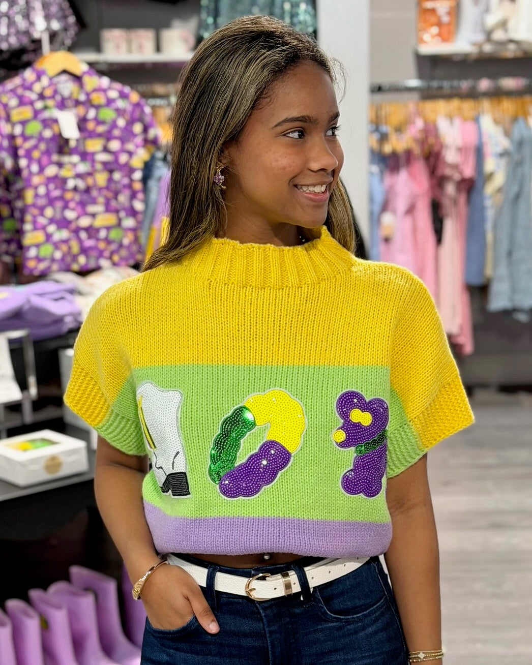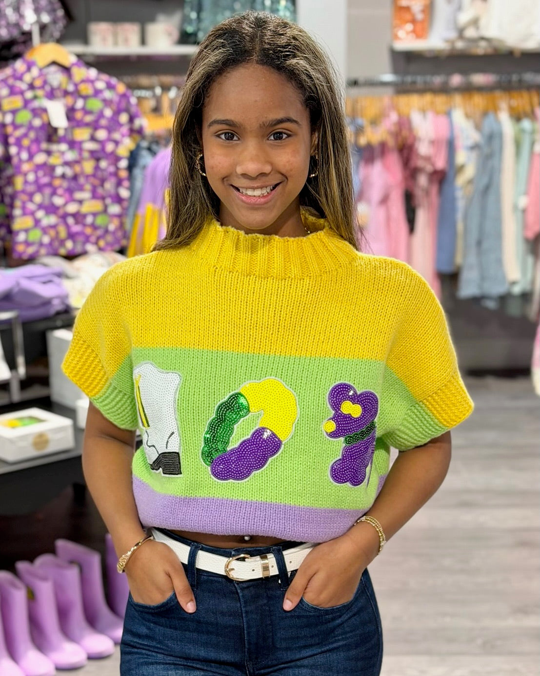 Grab the perfect top for Mardi Gras featuring boots with tassels, King Cake, and a balloon dog, all in traditional Mardi Gras colors!
