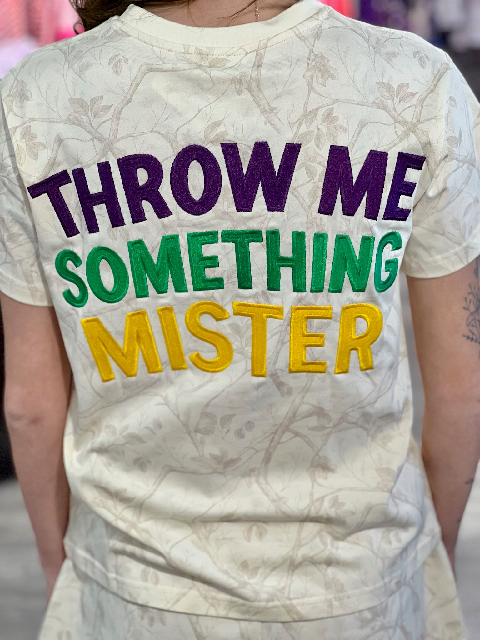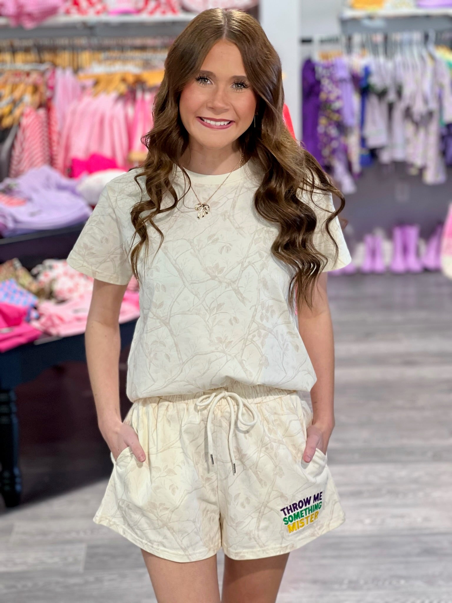 This two-piece camo set brings bold, playful style to casual wear with a festive twist. Featuring a classic camouflage print, the set includes a matching top and bottoms designed for comfort. The standout detail is the “Throw Me Something Mister” embroidery on the back, adding a fun, spirited vibe perfect for Mardi Gras celebrations or making a statement year round!