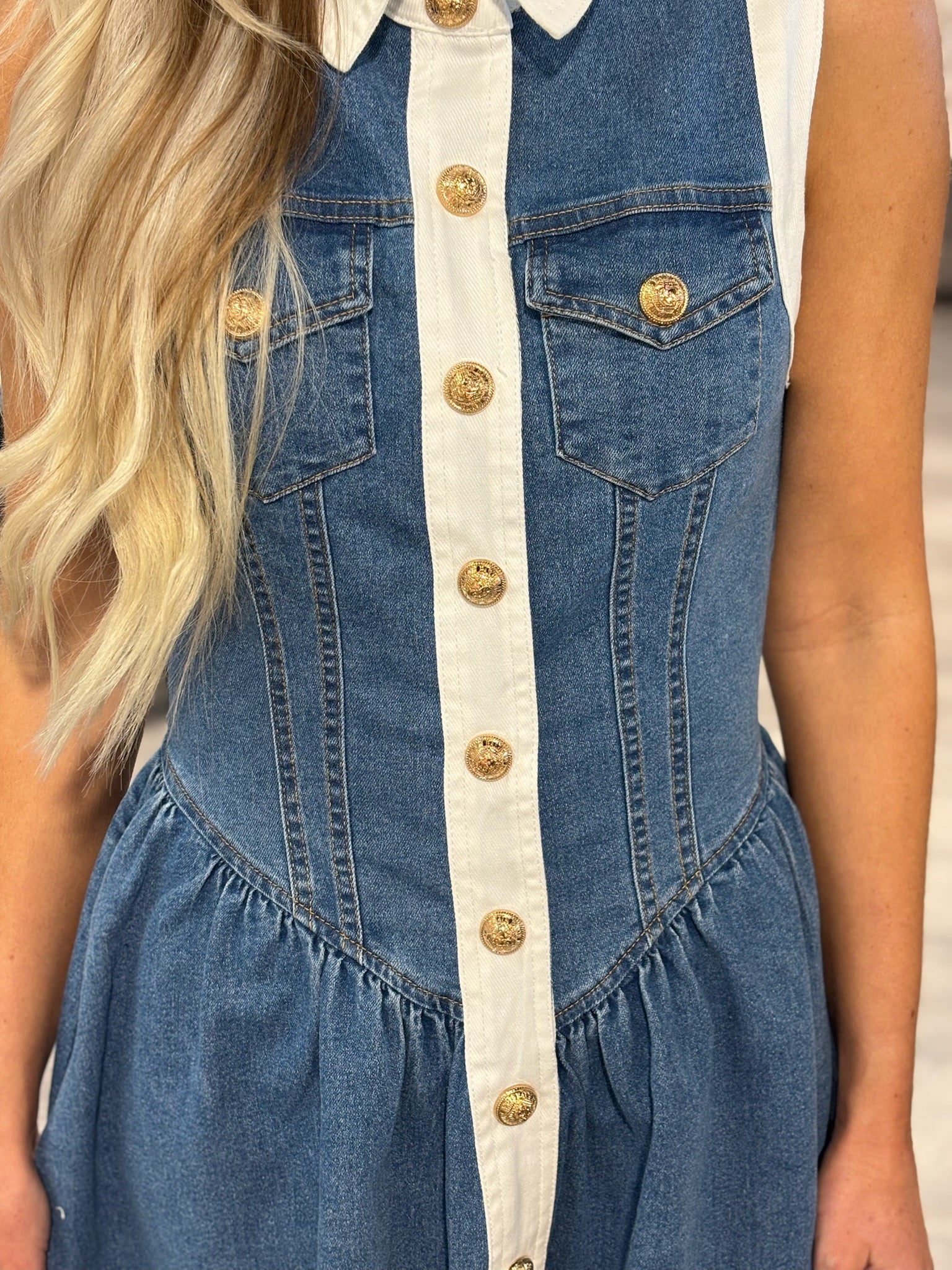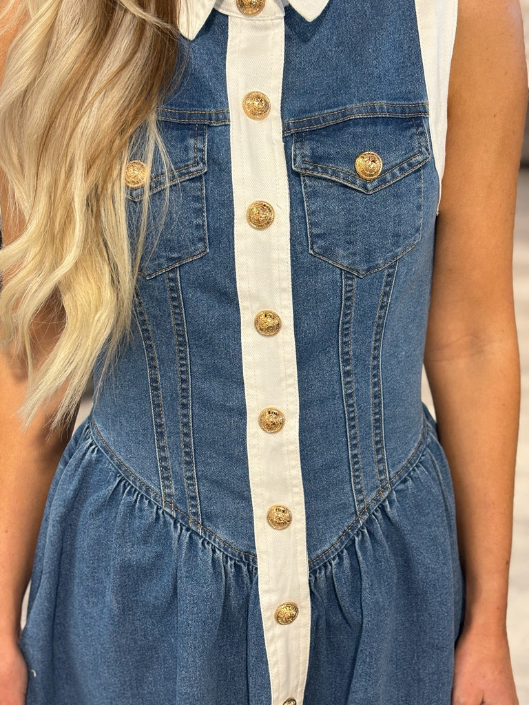 Get ready to turn heads in the playful Clarice Denim Contrast Dress! This denim dress features trendy gold buttons and crisp white accents for a unique and stylish look. Perfect for a fun night out or a casual day around town. You'll love the quirky and fun touch this dress brings to your wardrobe!
