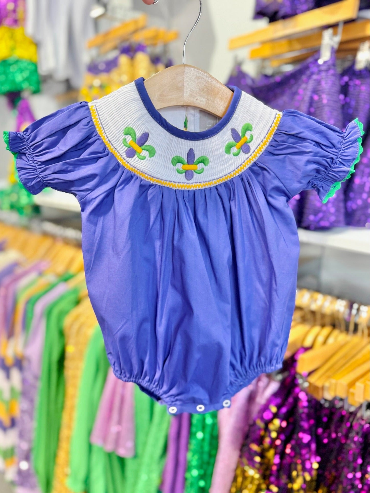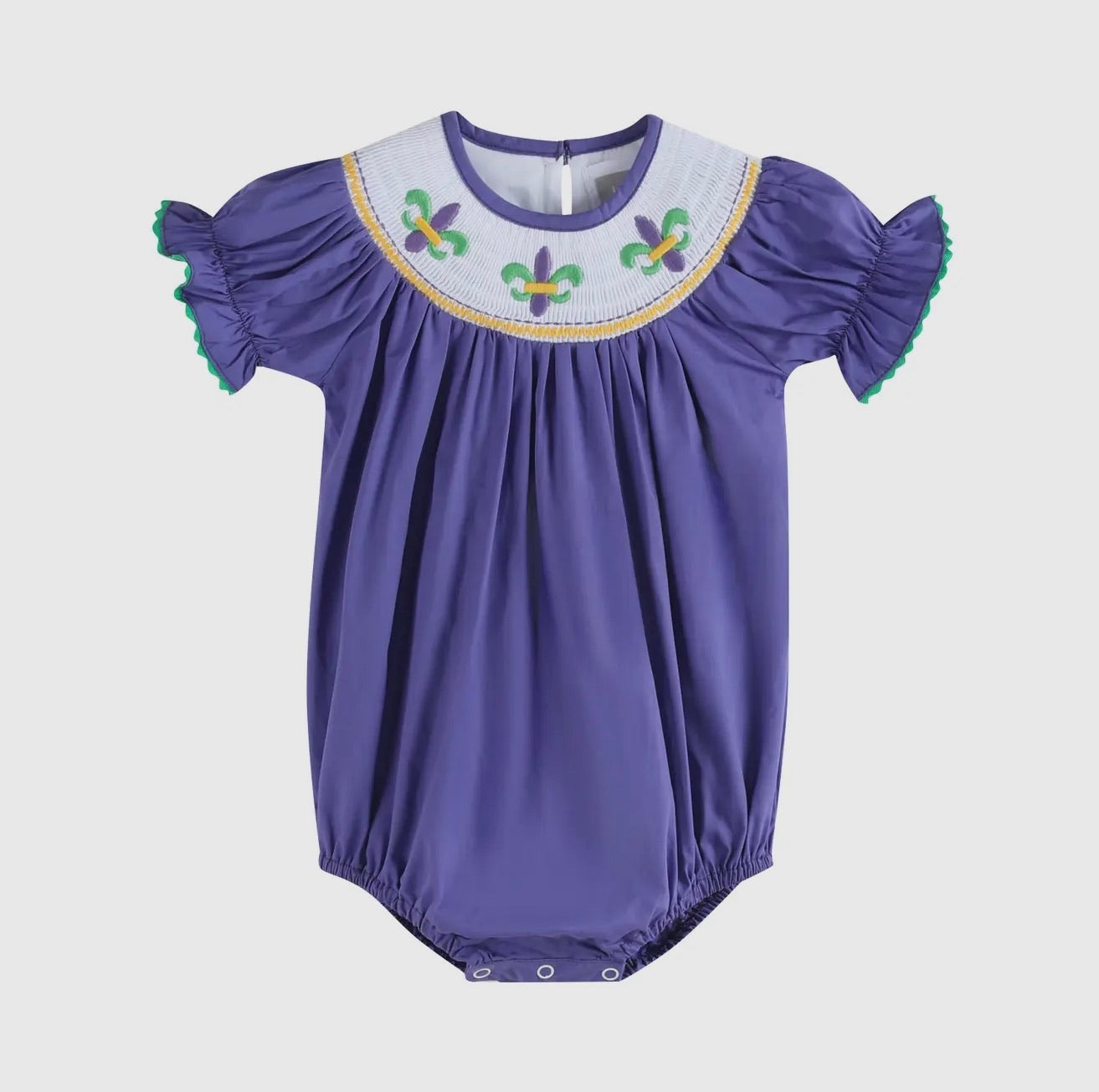 Smocked Mardi Gras Romper - 3-6 months is backordered and will ship as soon as it is back in stock.