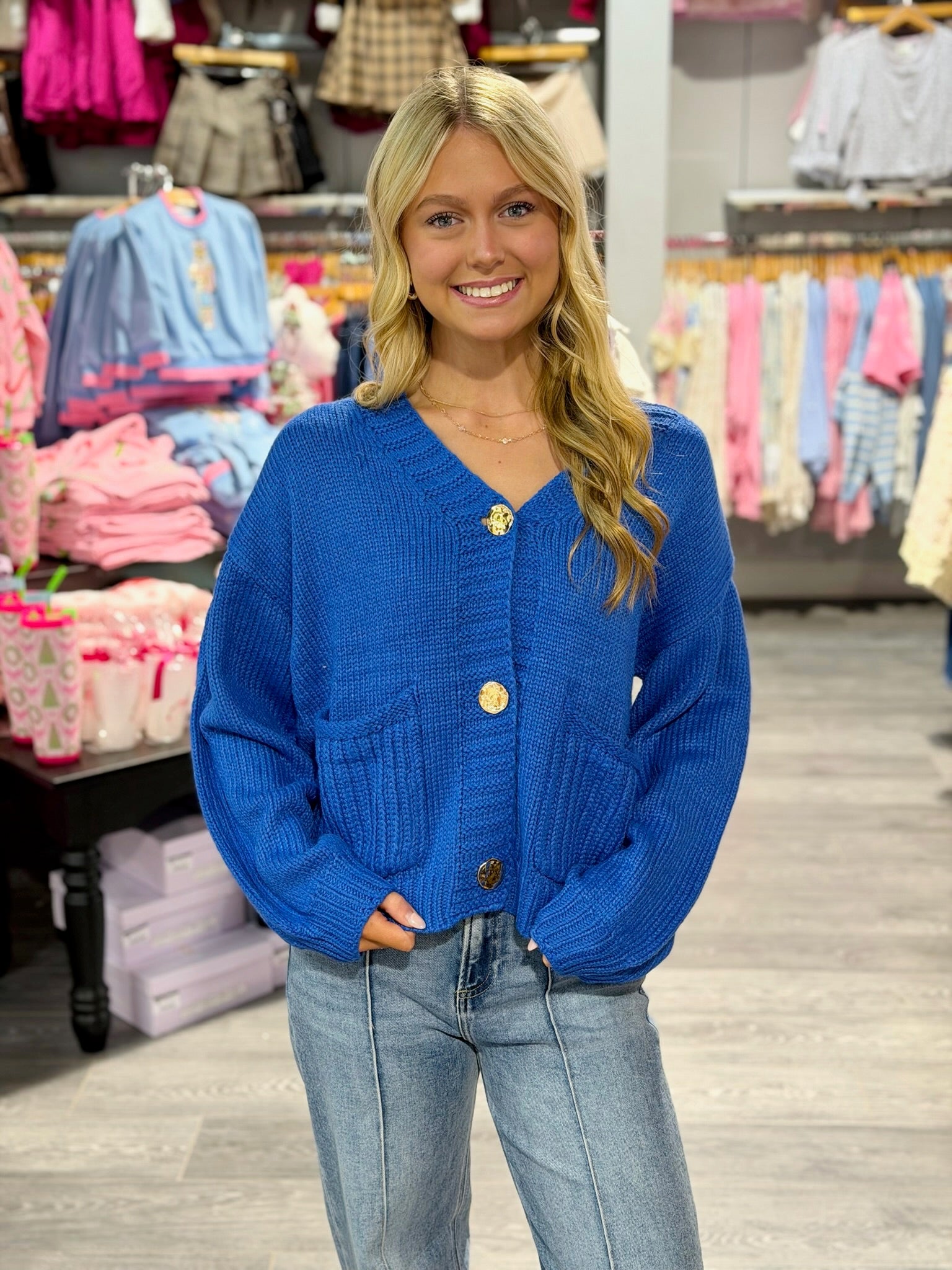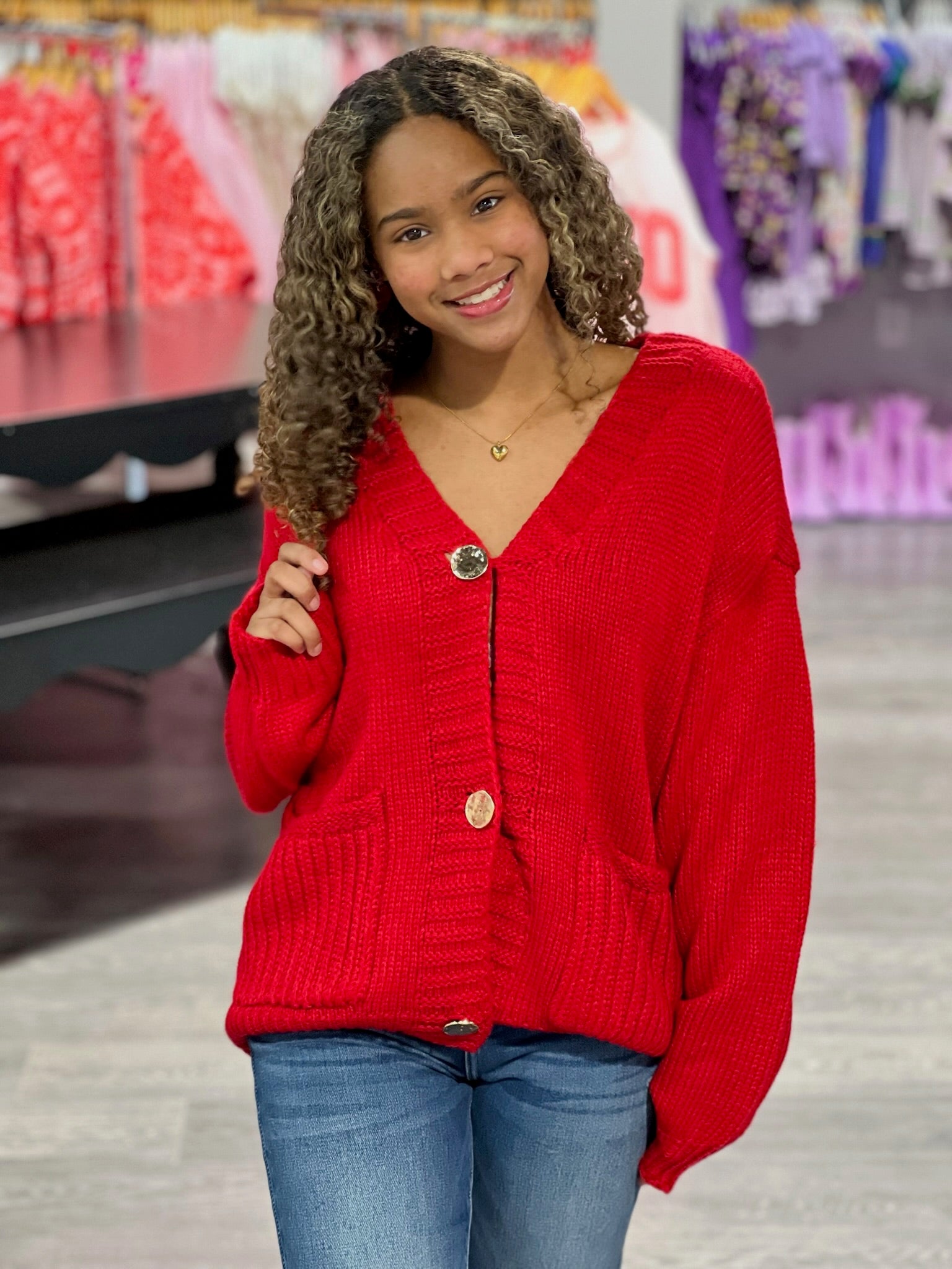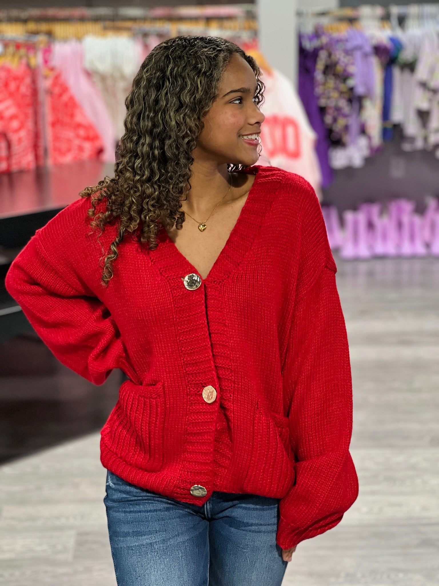 This red knit cardigan is a classic layering piece with elevated details. Crafted from a soft, cozy knit, it features functional front pockets and luxe gold button accents that add a polished touch to the timeless silhouette. With its comfortable fit and vibrant color, this cardigan is perfect for dressing up everyday outfits or adding warmth and style to your favorite looks!