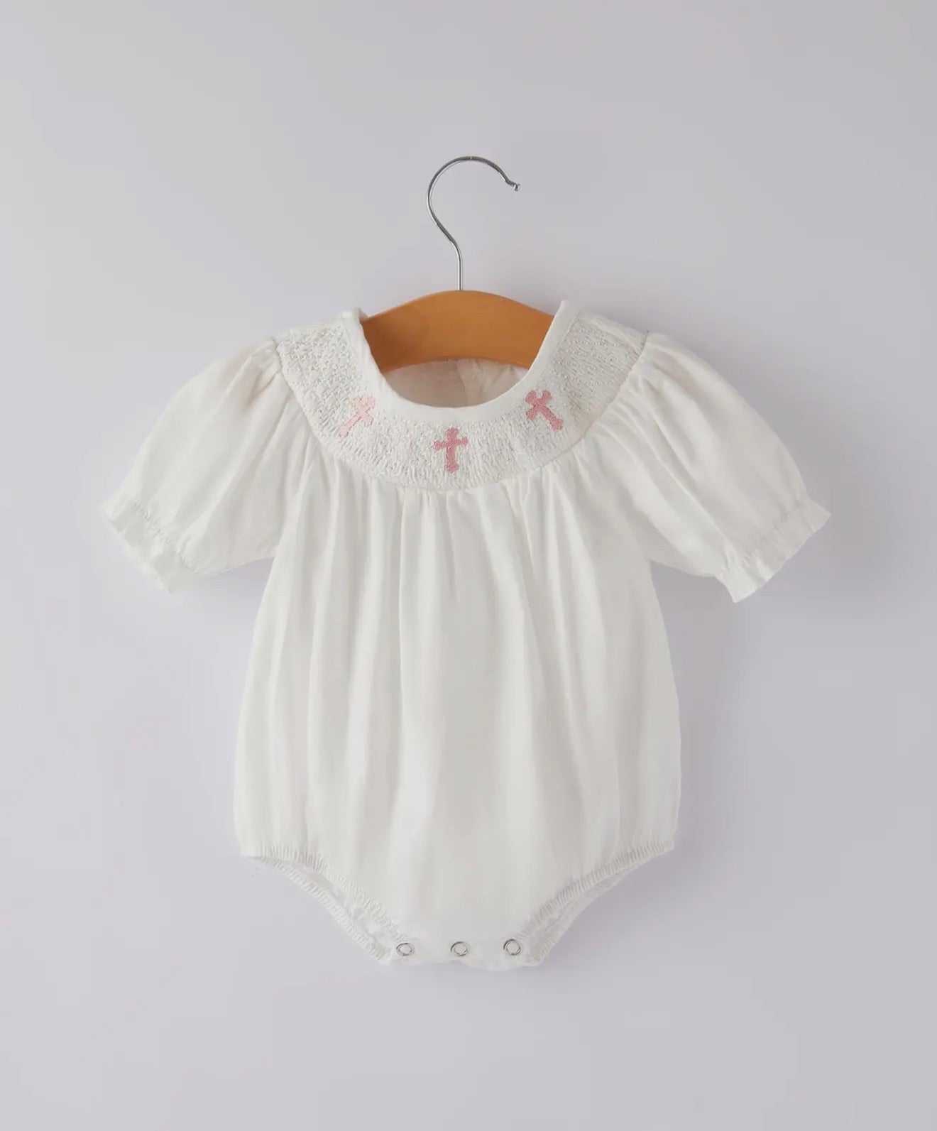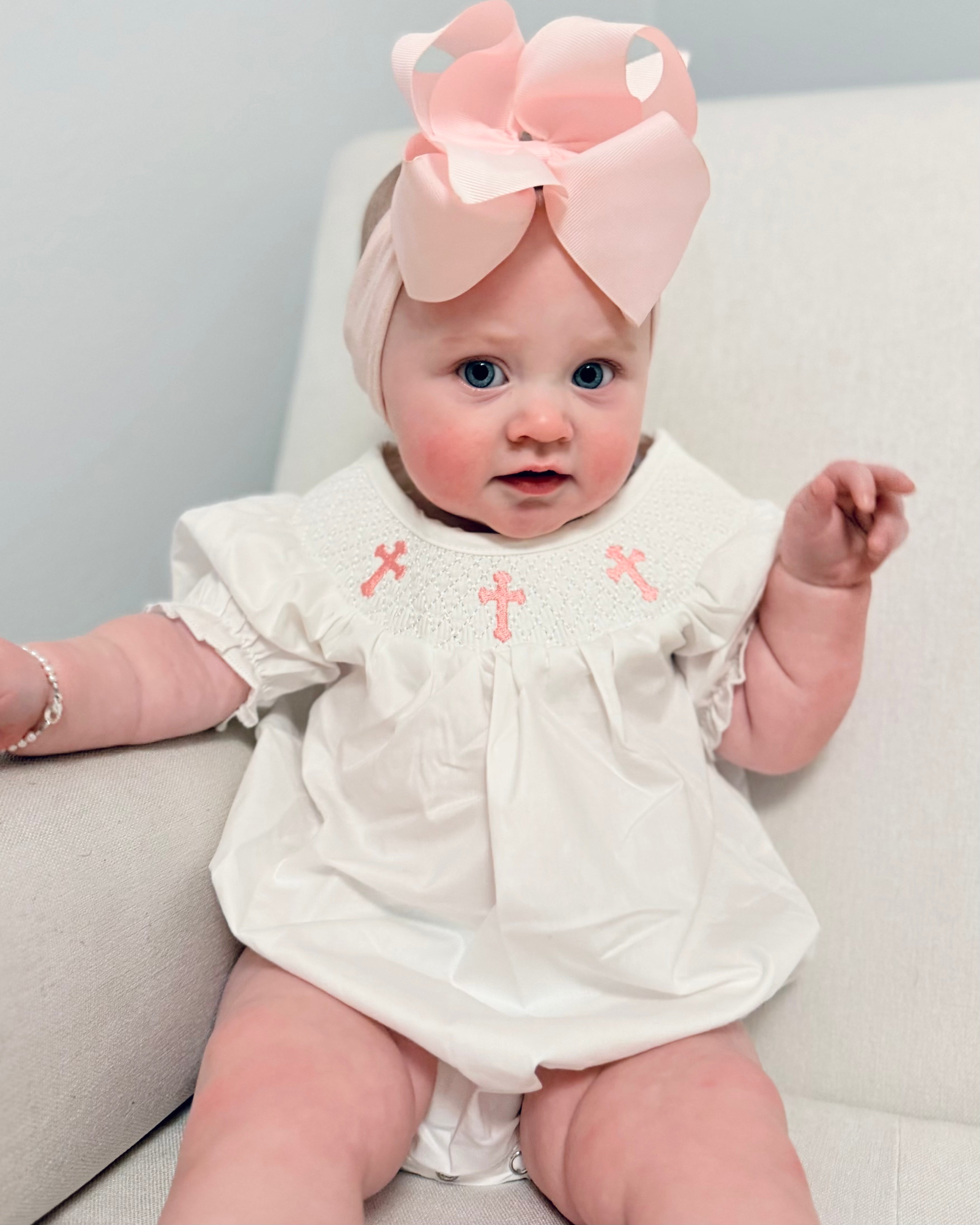 Infant Cross Smocked Bubble Romper - 3M is backordered and will ship as soon as it is back in stock.