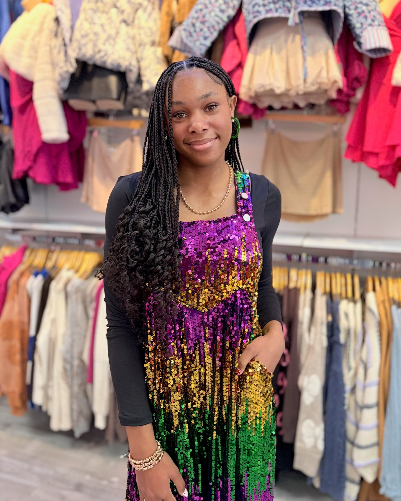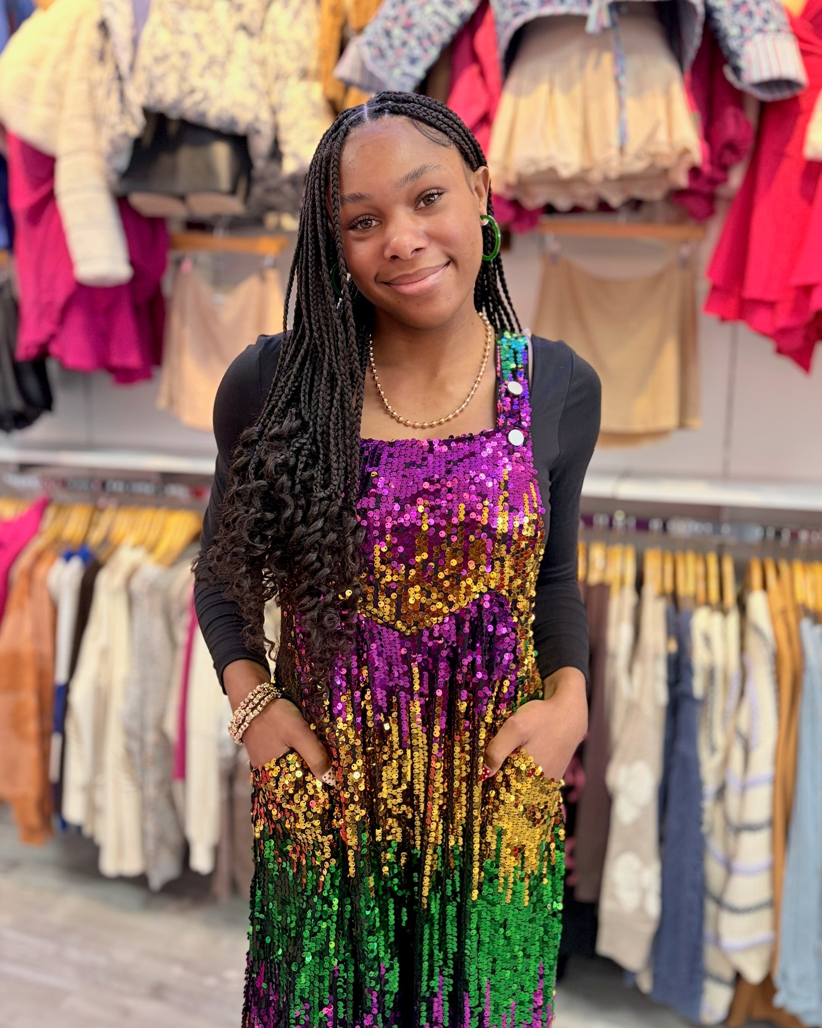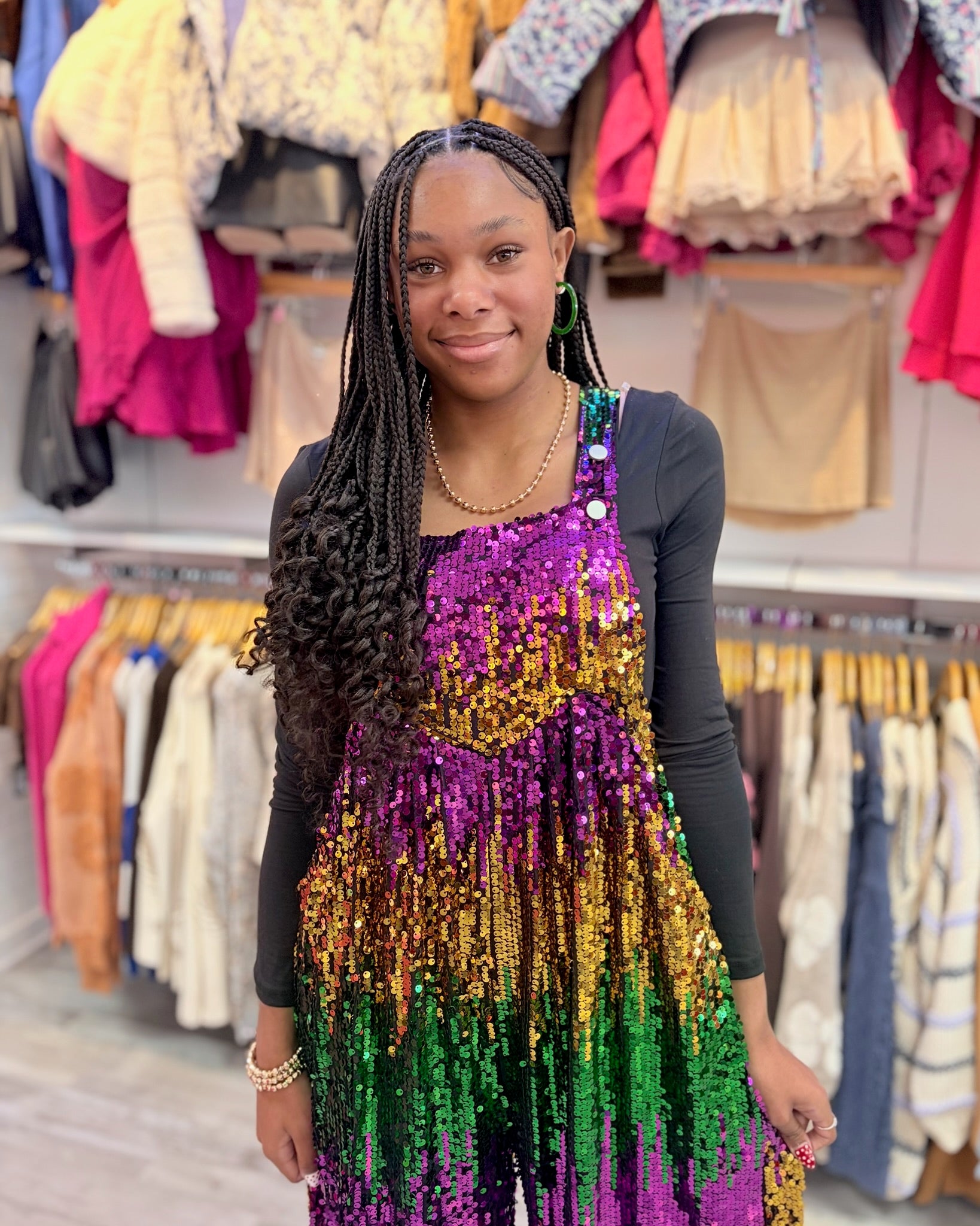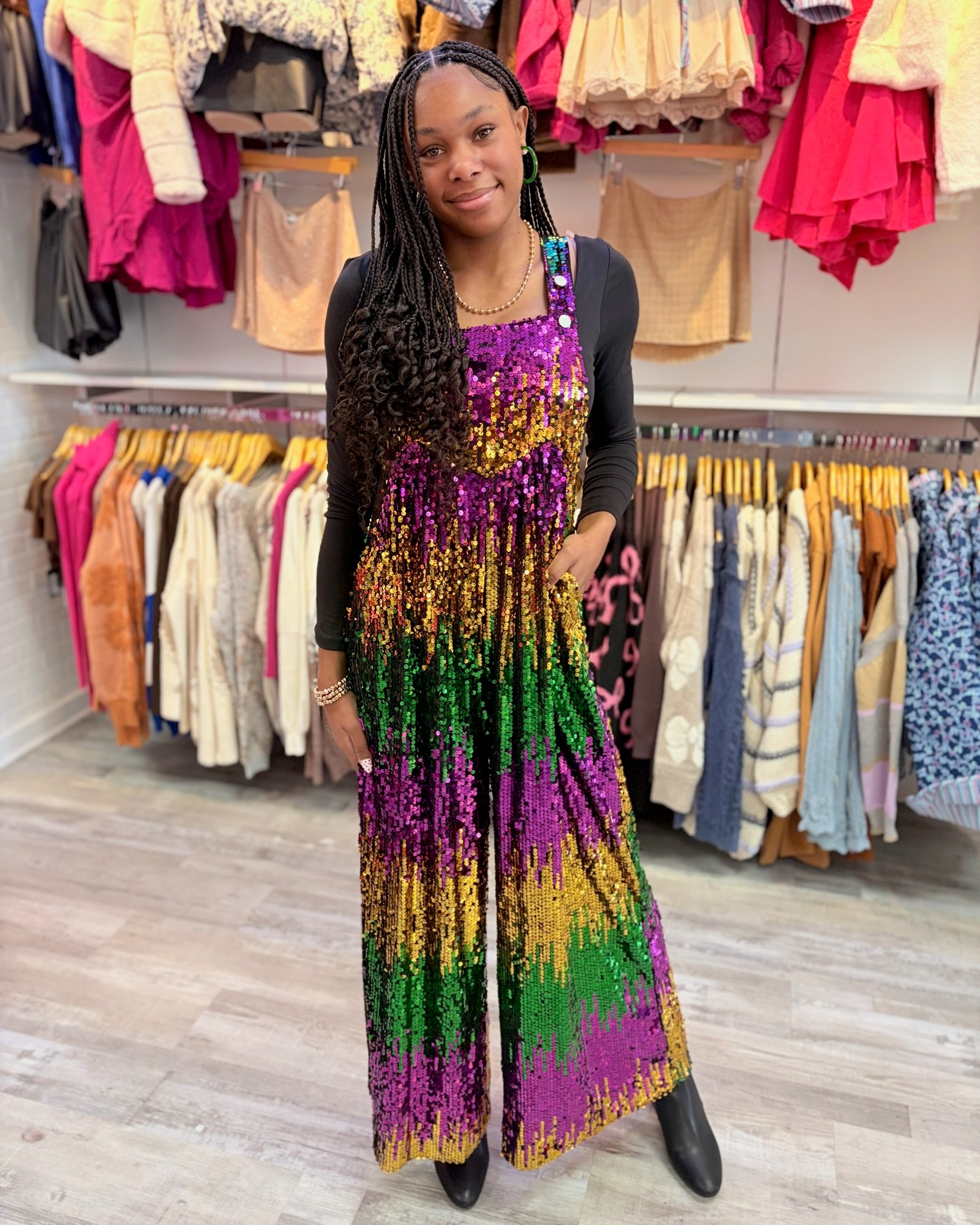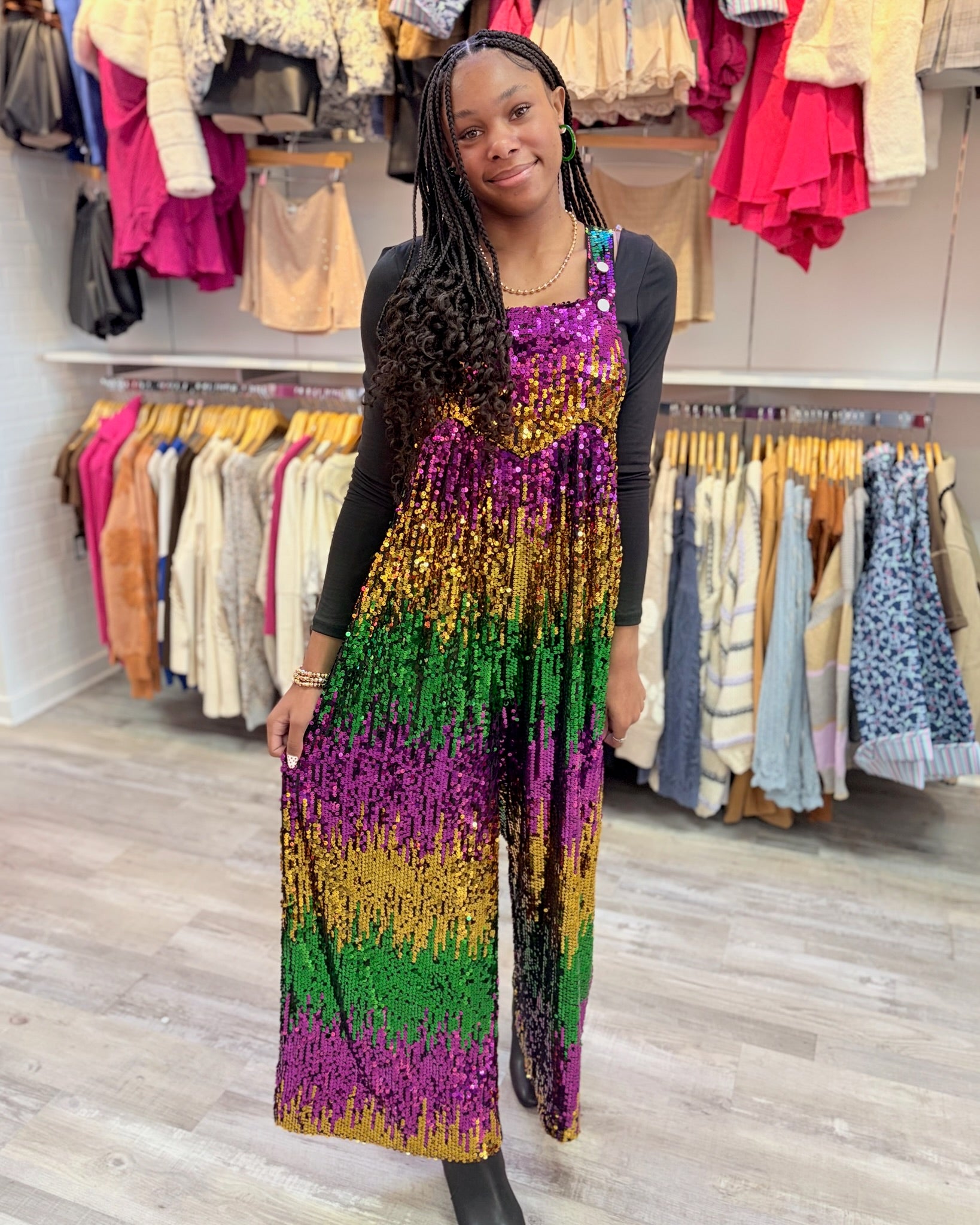 Mardi Gras Sequin Overalls - Small is backordered and will ship as soon as it is back in stock.