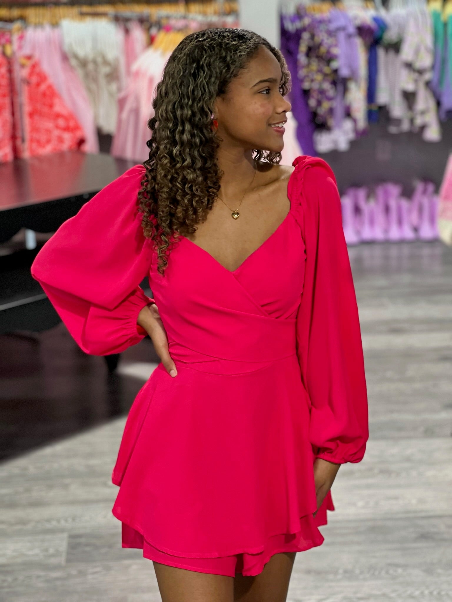 This long sleeve pink romper is the perfect blend of elegance & playful charm. Designed with a flattering silhouette, it features long sleeves for a polished look and a feminine tie-back detail that adds a touch of romance while allowing for an adjustable fit. Crafted from a smooth, lightweight fabric, this romper moves beautifully and feels comfortable all day or night. Ideal for special occasions, parties, or stylish evenings out, it’s a standout piece that delivers effortless sophistication with a sweet finish!
