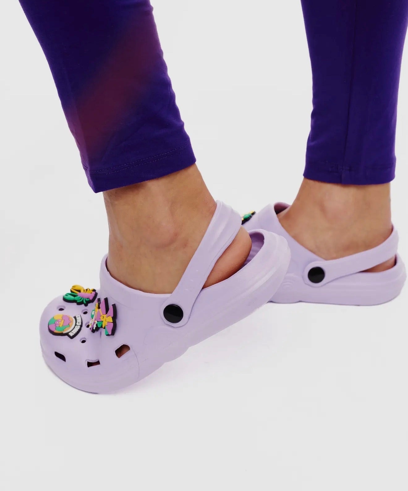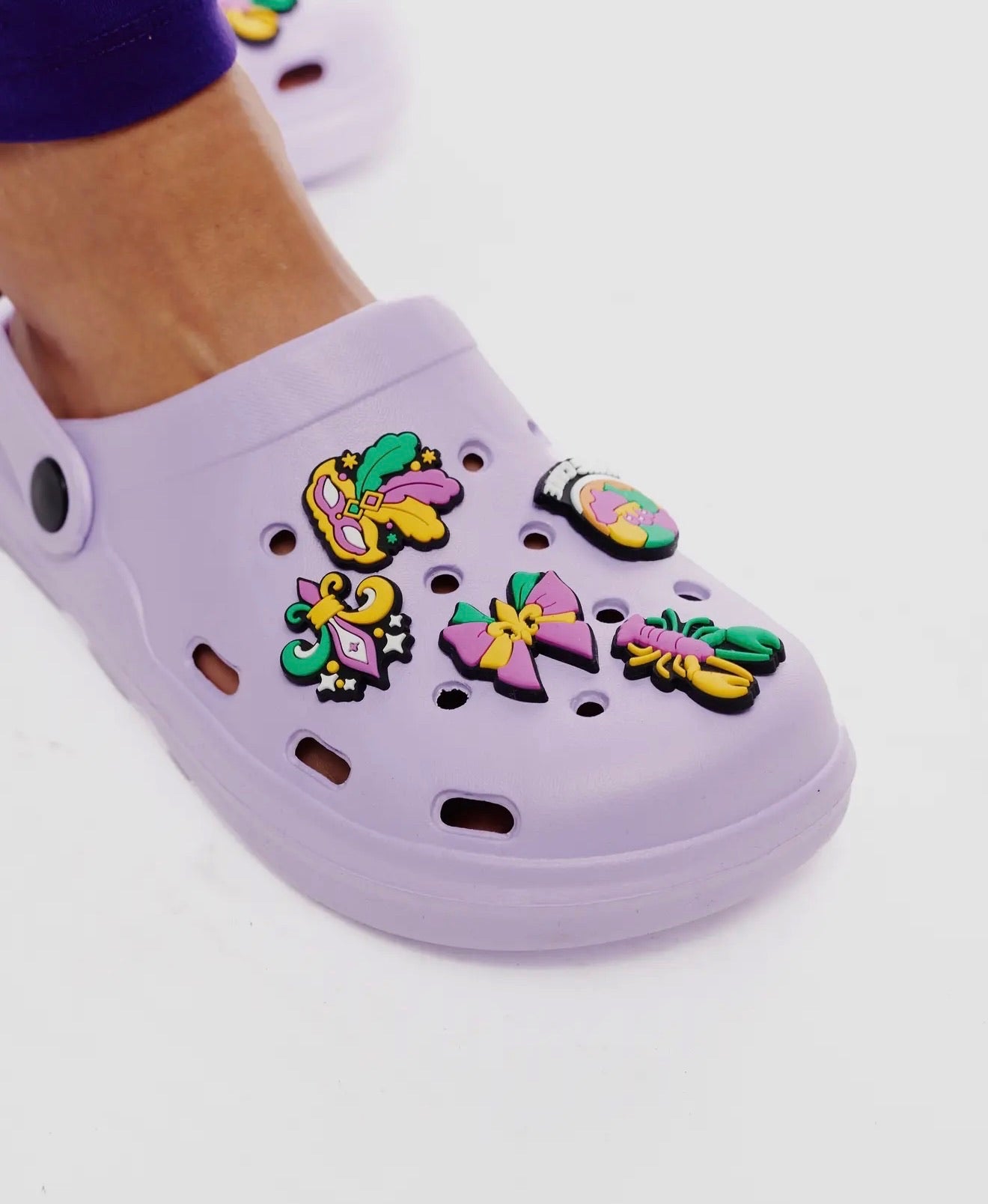 Celebrate in festive style with these eye catching Mardi Gras clogs, designed to bring color & fun to every step. Crafted in a soft lavender hue, these lightweight clogs are adorned with vibrant Mardi Gras inspired charms featuring masks, bows, crawfish, beads, and playful graphics in classic purple, green, and yellow tones. The breathable perforated design offers all day comfort, while the easy slip on silhouette makes them perfect for parades, parties, or everyday wear with a festive twist. Fun, comfortable, and full of Mardi Gras spirit, these clogs are the perfect statement shoe for celebrating in style!