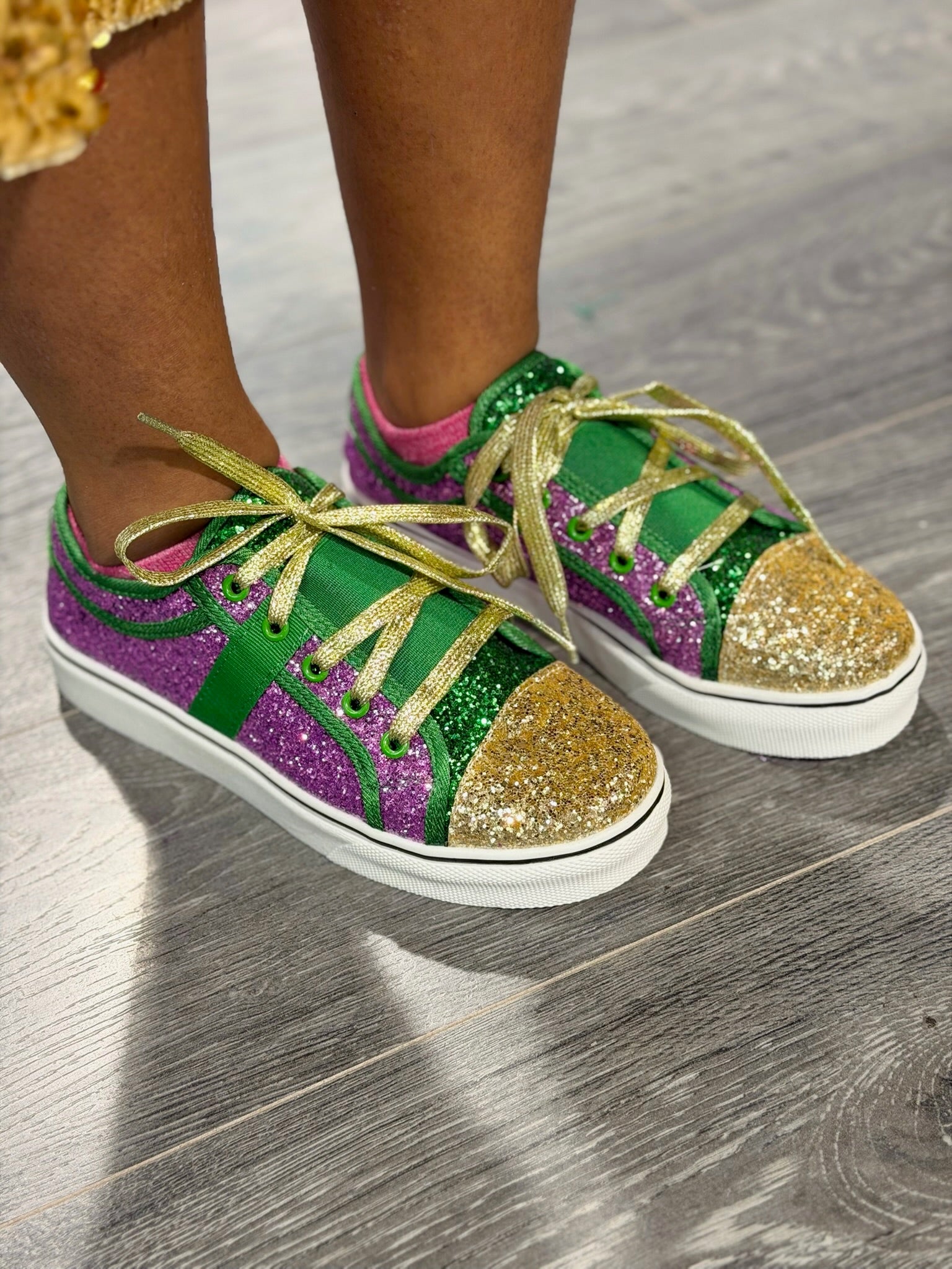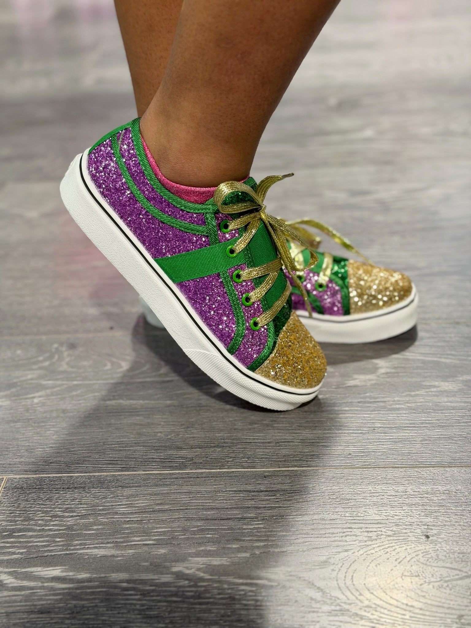 Step into sparkle with these festive Mardi Gras sneakers, designed to shine with every move. Featuring a vibrant mix of glittery purple, green, & gold panels, these eye catching sneakers capture the spirit of celebration in bold style. Perfect for parades, parties, or everyday fun, these Mardi Gras sneakers bring playful color, sparkle, & celebration to every step!