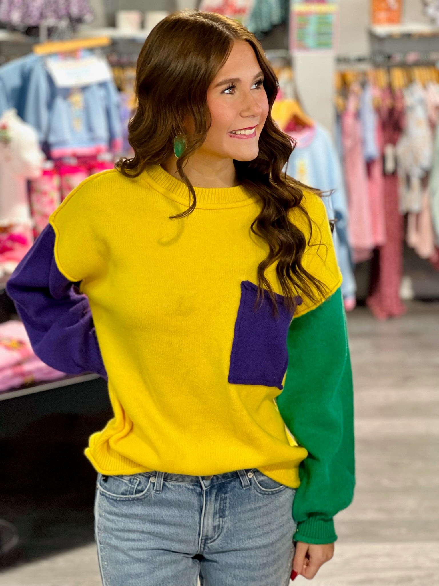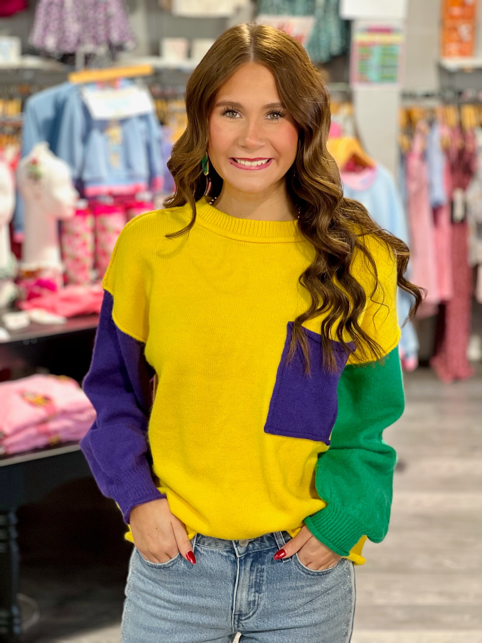 It's Mardi Gras any time with this 90's style color-block sweater!