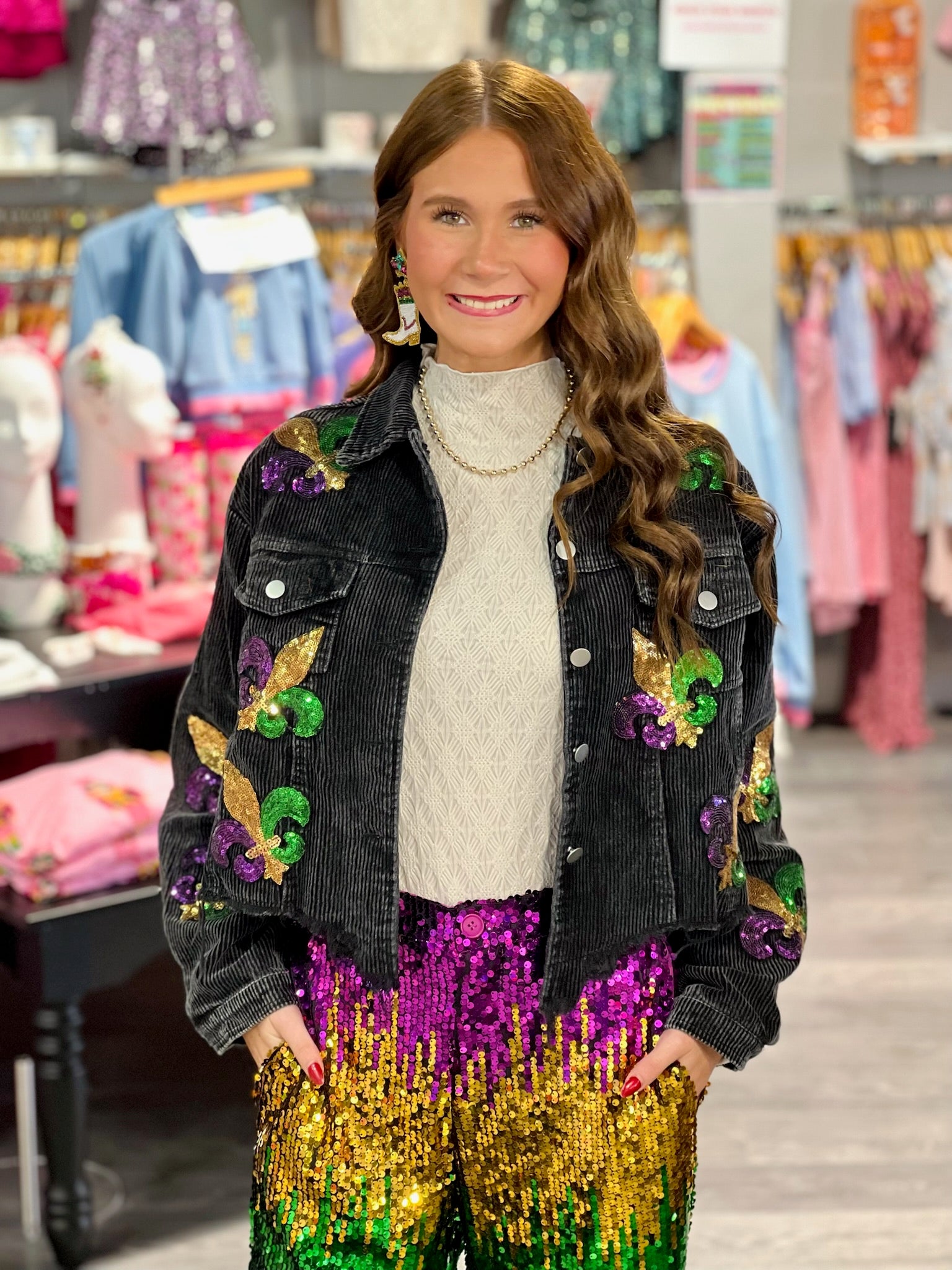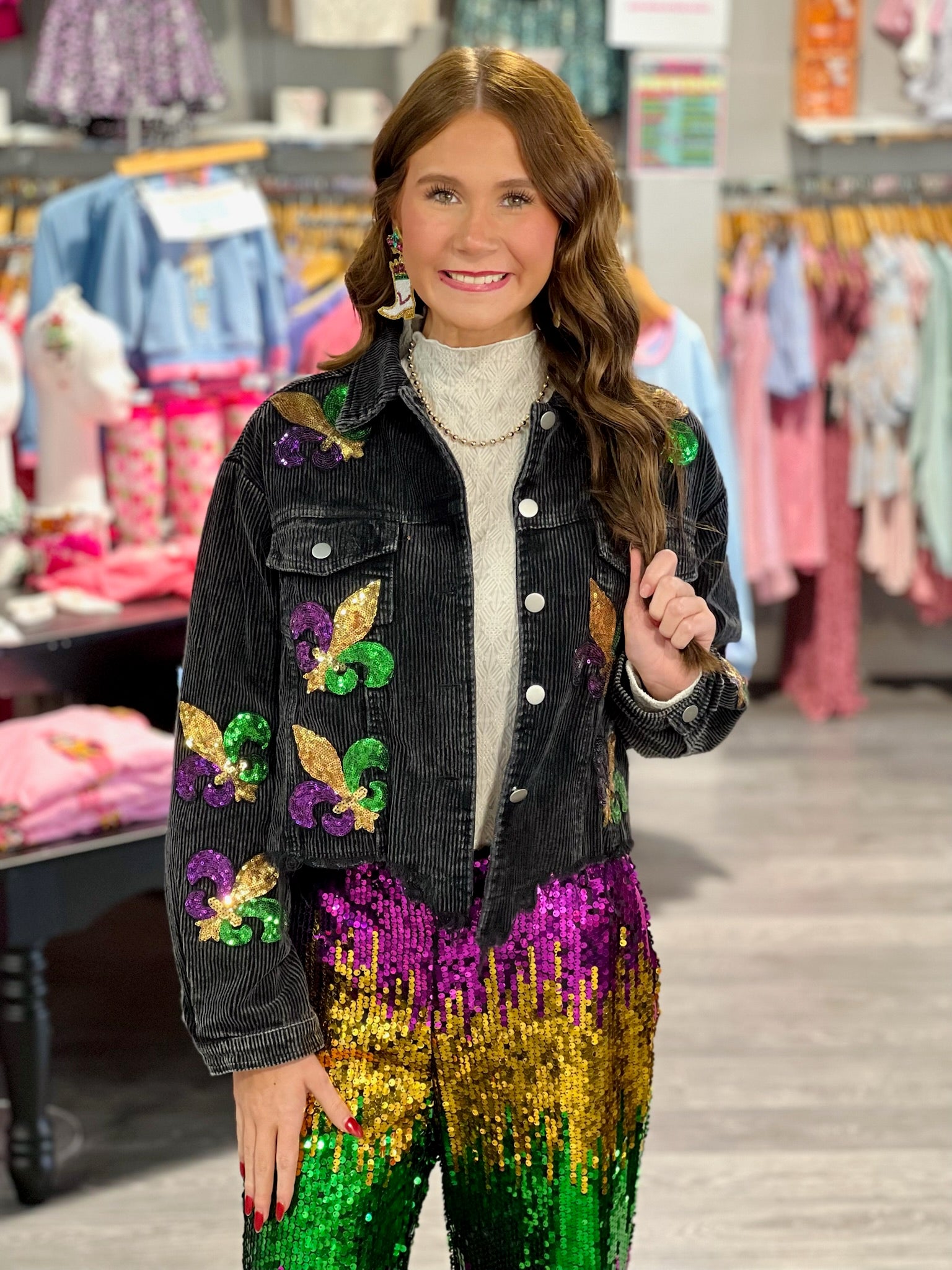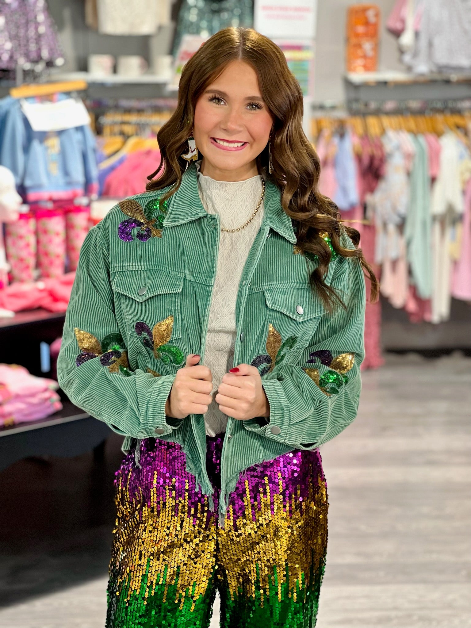 Everyone's favorite jacket is back this time in Mardi Gras colors! Grab the best-selling distressed sequin patch jacket in time for all the parades.