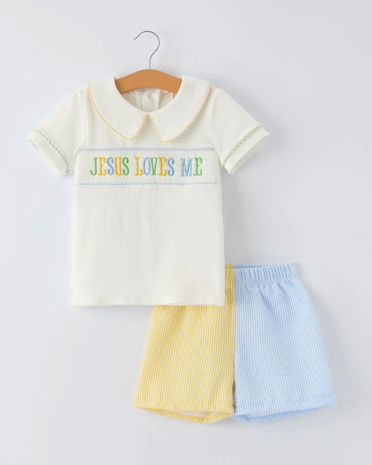 Jesus Loves Me Boy's Outfit - 2T is backordered and will ship as soon as it is back in stock.