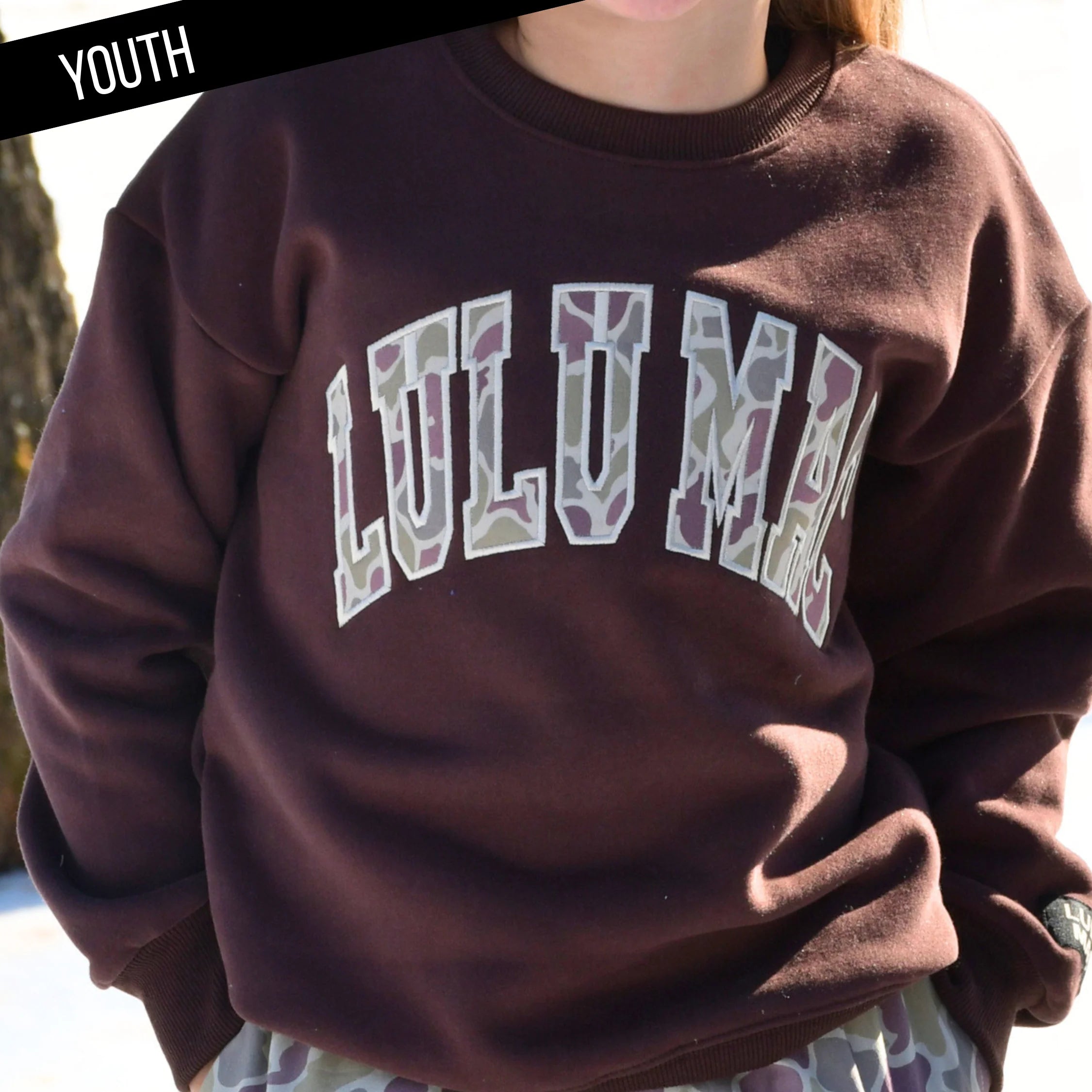 Youth LuluMac Camo Stitch Sweatshirt - Black / Youth Small is backordered and will ship as soon as it is back in stock.